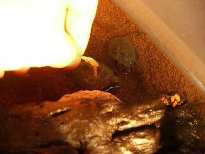特に富士子は・・・・・首をもたげて 「お腹が減った」 アピール。なんでもバクバク食べてくれるから楽ですね~(と言ってもまだ3~4cmなので胃袋を考えたら、一日2・3粒ですけどね~)この、粒の人工餌が一番バランスが良くて良いようです。今日は初めて、手から直接餌を食べてくれました・・・・・・感動した(泣)